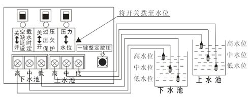 下水池用訊號(hào)線需跟廠家另行訂購,不能設(shè)置空載(即空載為000)。上水池的水用到中水位時(shí)會(huì)開始抽水,抽到高水位會(huì)水滿停機(jī)。下水池滿至高水位時(shí)會(huì)開始抽水,抽到中水位時(shí)會(huì)停機(jī),即缺水保護(hù)。上、下水池之低水位訊號(hào)線都是起回路作用。