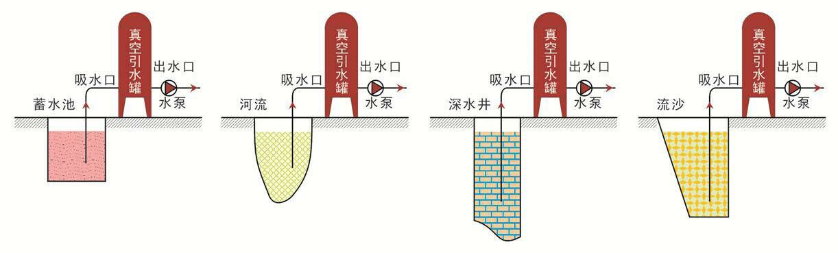 使用前真空罐內須加滿水,當罐內的水被水泵吸出,罐內產生負壓(真空)后,由于大氣壓的作用,蓄水池內的水通過吸水管進入真空罐,通過水泵源源不斷的供水。
